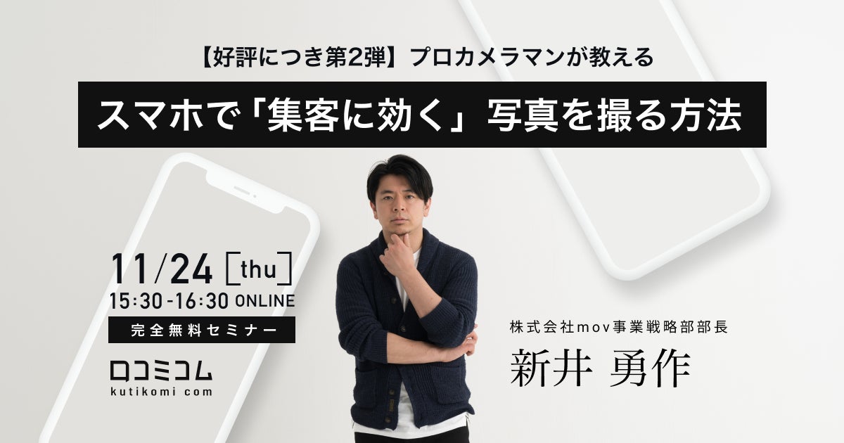 今月は上記セミナーに加え、「プロカメラマンが教える!スマホで「集客に効く」写真を撮る方法」を開催いたします。スマートフォンを使った「集客力をUPする写真」を撮る方法について、実例をまじえながらわかりやすく解説します!