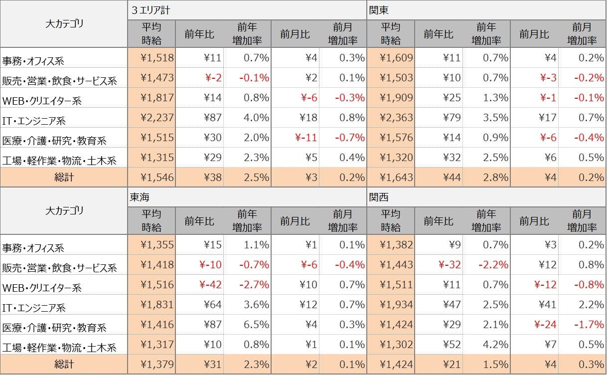 エリア別の平均時給について、関東エリアは1,643円(前年比44円増、前月比4円増)、東海エリアは1,379円(前年比31円増、前月比2円増)、関西エリアは1,424円(前年比21円増、前月比4円増)となりました。