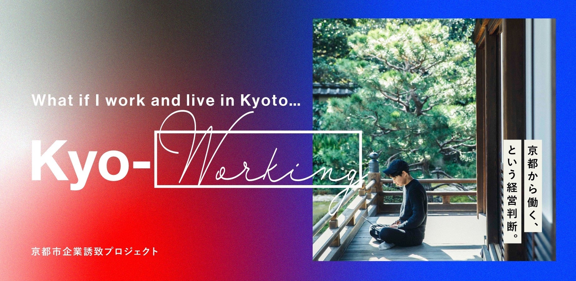 京都市は、こうした背景から、企業の本市への拠点進出を促進するために、「京都で暮らし、京都から働く」新しいワークライフスタイルを、“Kyo-working(京ワーキング)”と名付けました。
