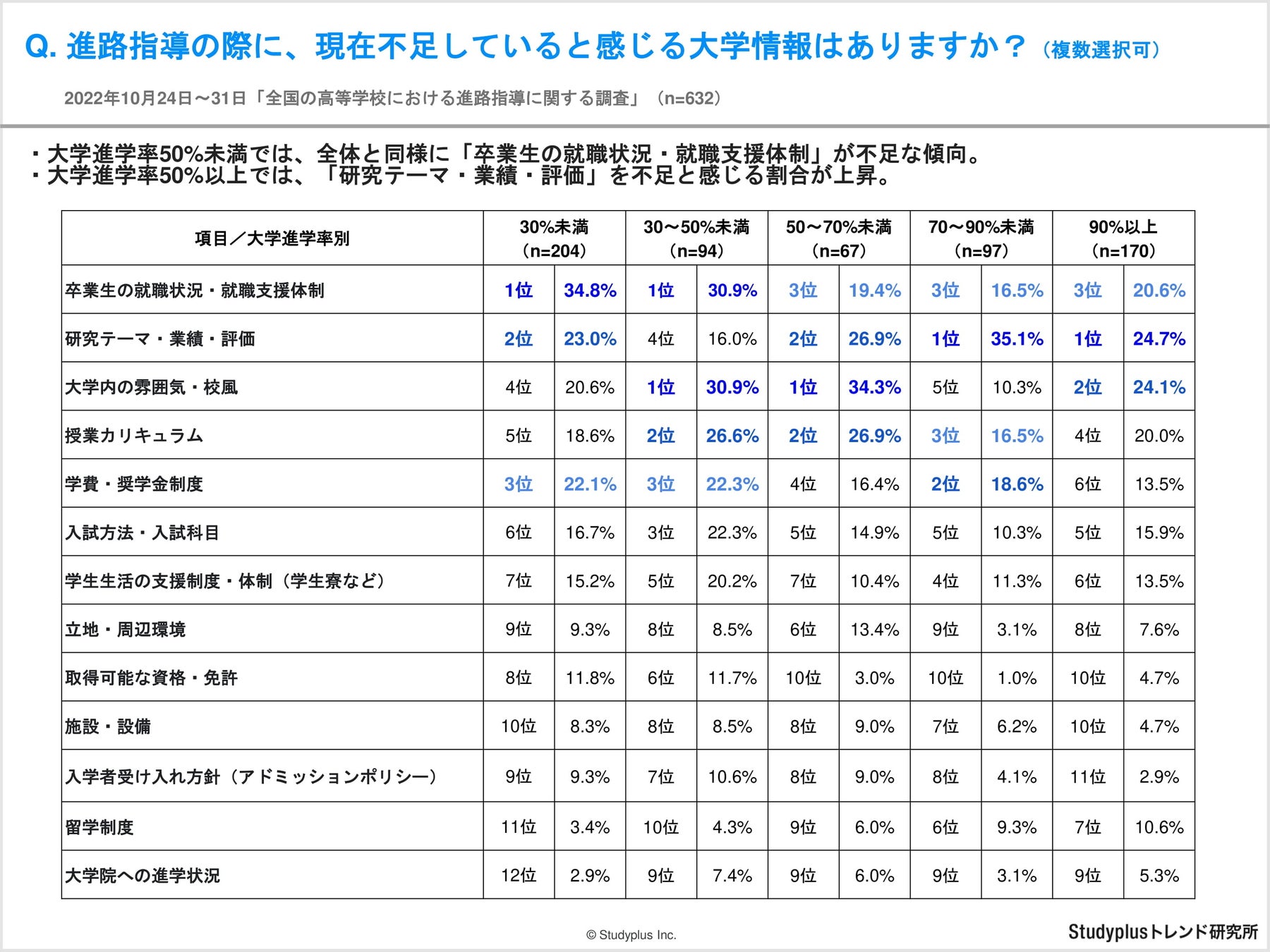 ・現在不足していると感じる大学情報は、最多は「卒業生の就職状況・就職支援体制」。特に大学進学率50%以下で割合が高く、50%以上では「研究テーマ・業績・評価」の割合が高くなる傾向。
