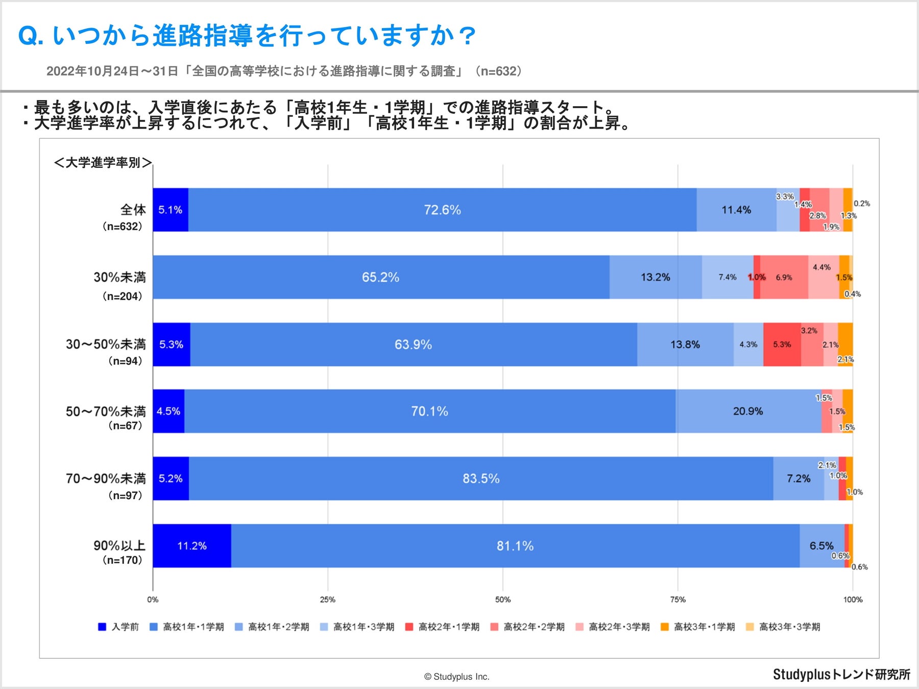 大学進学率が高くなるほど、進路指導をはじめる時期が早まる傾向も。