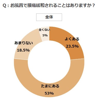 お風呂で腰痛が緩和されることがあるかどうか、という問に対しては、よくある・たまにあるが合わせて76.8%と高い割合となりました。