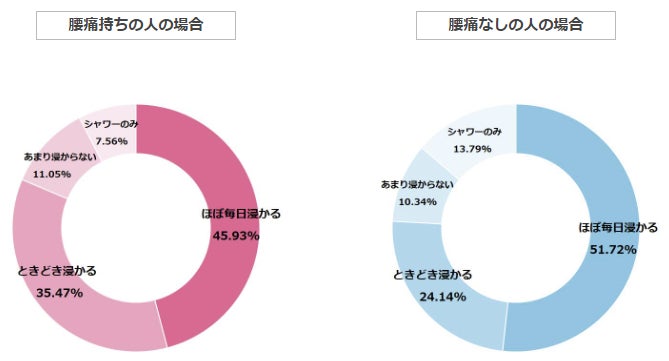 毎日湯舟に浸かるかどうかという問には、ほぼ毎日浸かるという人が約47%。 腰痛持ち・腰痛なしの人をそれぞれで見てみると腰痛持ちの人は約46%なのに対し、腰痛なしの人は約52%という割合になりました。 しかしときどき浸かる、という回答ですとこれが逆転し、腰痛持ちの人は35%、腰痛なしの人は24%となっています。