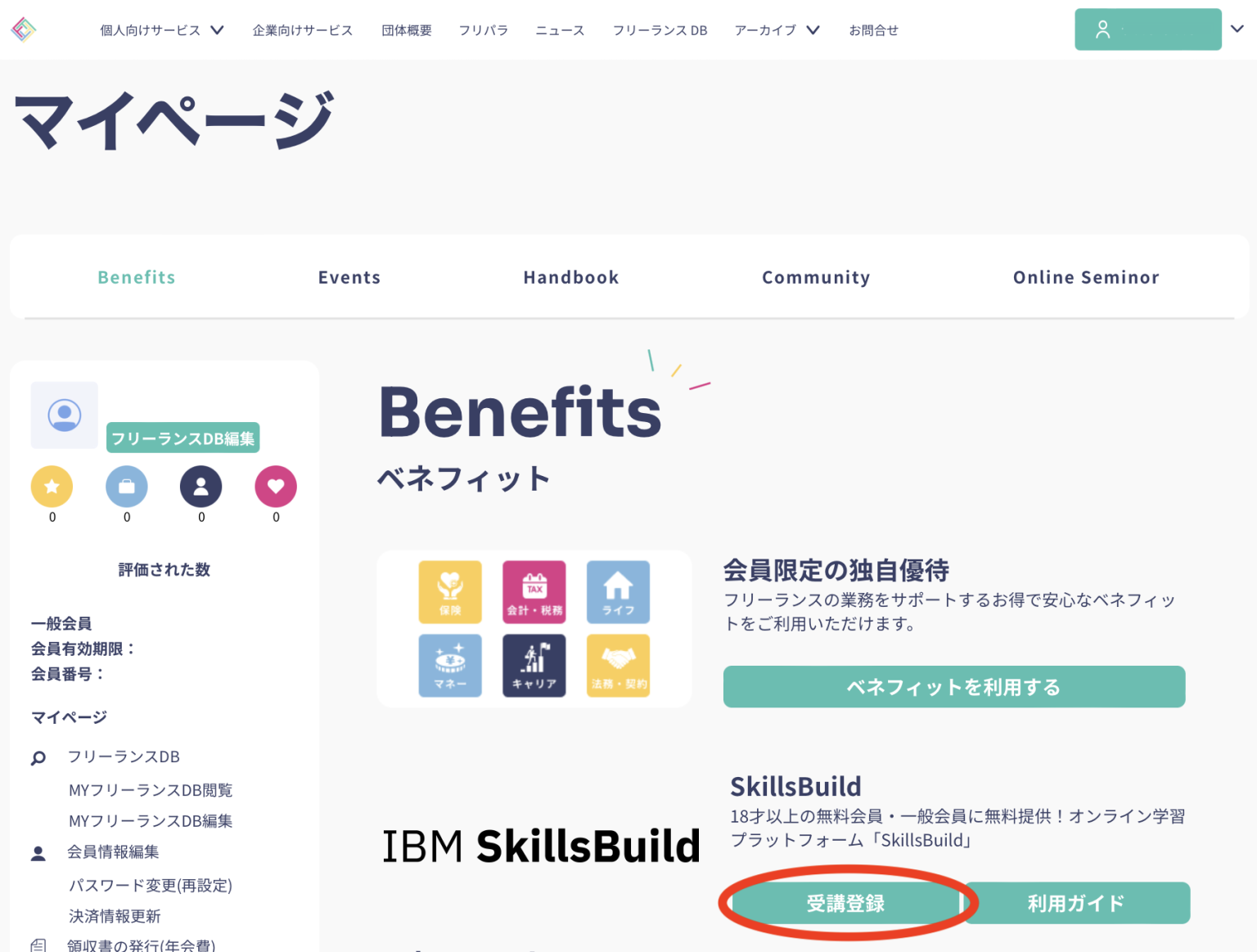 フリーランス協会マイページ (https://www.freelance-jp.org/mypage) 内にあるIBM SkillsBuild受講登録フォームから利用申請をお願いします。既に会員情報を登録されている方は、会員情報がフォームに反映されています。無料会員の方で、まだ会員情報を登録されていない方はこれを機にご登録ください。