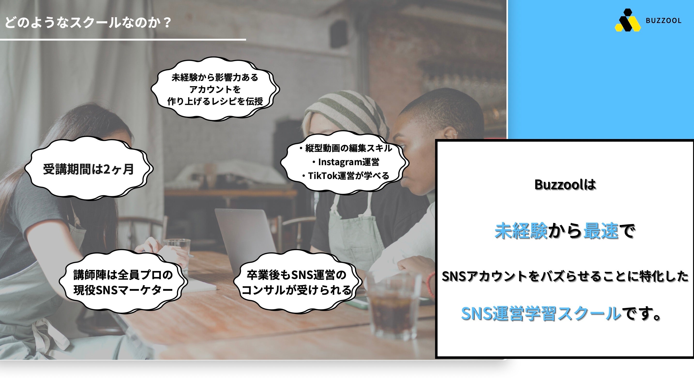 Buzzoolは株式会社カツオザブリッチが提供する「ゼロから影響力のあるアカウントを育てる」ことを目的としたSNS特化型マーケティングスクールです。「圧倒的コスパ」「伴走型コンサルティング」「リアルタイム直接指導」を通して卒業後は”ビジネスに影響力をもたらすSNS発信ができるようになる”そんな環境をご提供しております。