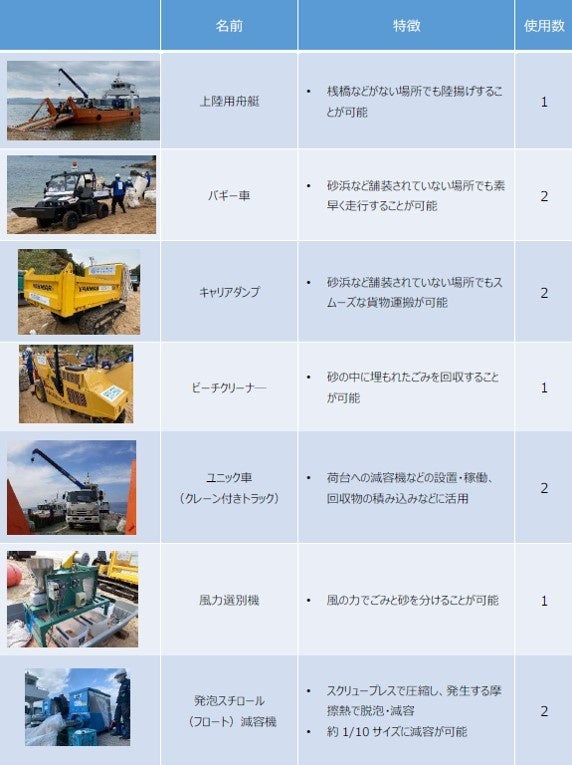 桟橋などがない場所でも陸揚げできる上陸用舟艇(民間フェリー)で着岸し、貨物運搬やビーチクリーンに使われる特殊車両、卸売市場や工場内などで用いられているプラスチックの減容装置などの機材※1を活用することで、阿多田島の長浦海岸、約350mに渡って散乱していた大型プラスチックごみ(フロート※2)など計約1.2トンを一掃しました。