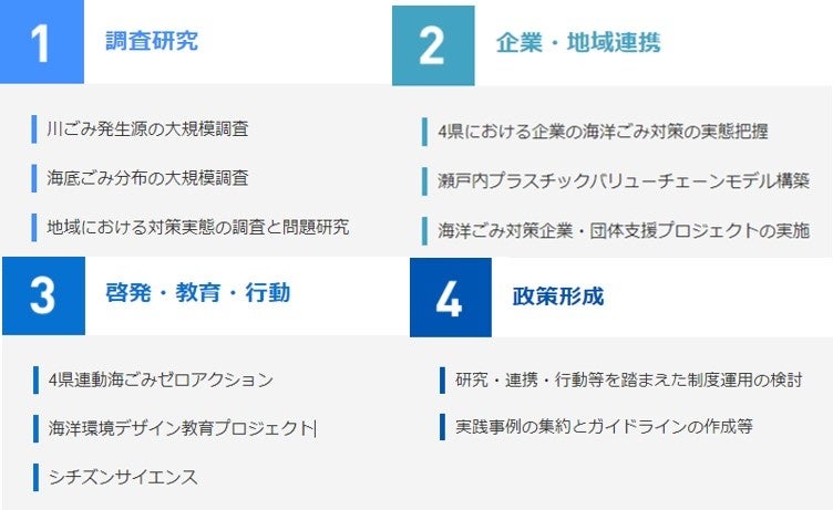 瀬戸内海に面する4県(岡山県、広島県、香川県、愛媛県)と日本財団が連携協定を締結(2020年12月)し、共同で推進している包括的海洋ごみ対策プロジェクト。外界からの海洋ごみ流入が少ない海域(閉鎖性海域)である瀬戸内海をフィールドに、①調査研究②企業・地域連携③啓発・教育・行動④政策形成の4つの柱で事業を実施。