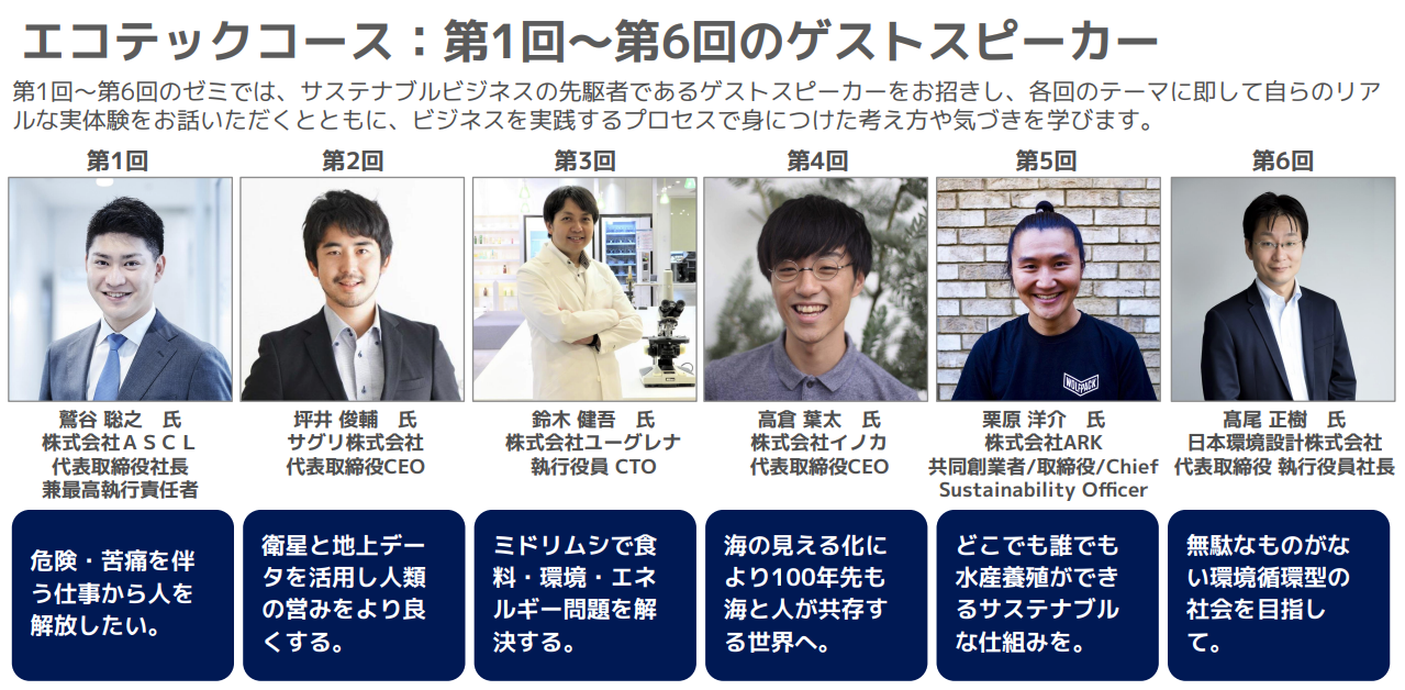 サグリ株式会社は、「人類と地球の共存を実現する」をビジョンに掲げ、地球上の農業発展と脱炭素社会に向け、衛星データ、AI技術を活用しています。当講演では、創業経緯や弊社のこれまでの取組、課題を乗り越えた経験、チームで何を実現したいのかを受講生に共有するとともに、サステナブルなビジネスを実施するために、どのような課題を解決し、解決した先にどのような世界を作るかについて受講生と議論します。