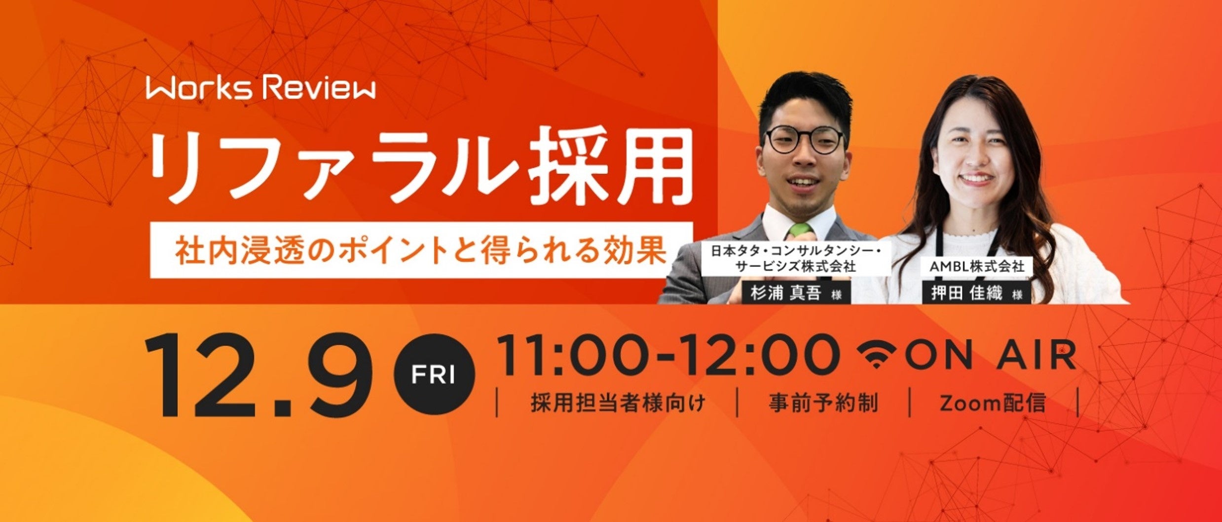 株式会社ワークス・ジャパン(本社:東京都千代田区、代表取締役:清水信一郎、以下 ワークス・ジャパン)は、2022年12月9日(金)に採用業務に従事する部門のご担当者様を対象にしたオンラインセミナー「リファラル採用 ~社内浸透のポイントと得られる効果~」を開催します。