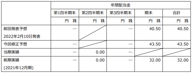 期末の配当予想につきましては、今回の業績予想の修正及び当期の自己株式取得に伴い、2022年2月10日に公表しておりました1株当たり40円50銭から3円00銭増額し、1株あたり43円50銭といたします。