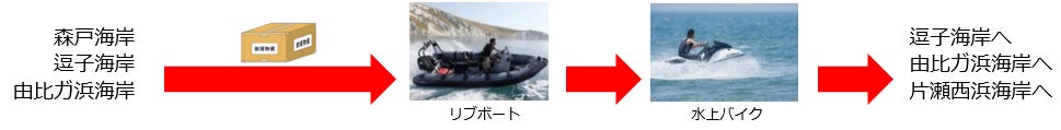 大規模災害により道路(陸路)が遮断された場合、海と山に囲まれたこの地域は孤立する課題を抱えており、海路は貴重な輸配送ルートとなります。また、船では港にしか着岸できませんが、リブボートや水上バイクを活用することで浜に上陸できることから輸配送の地点が拡大します。