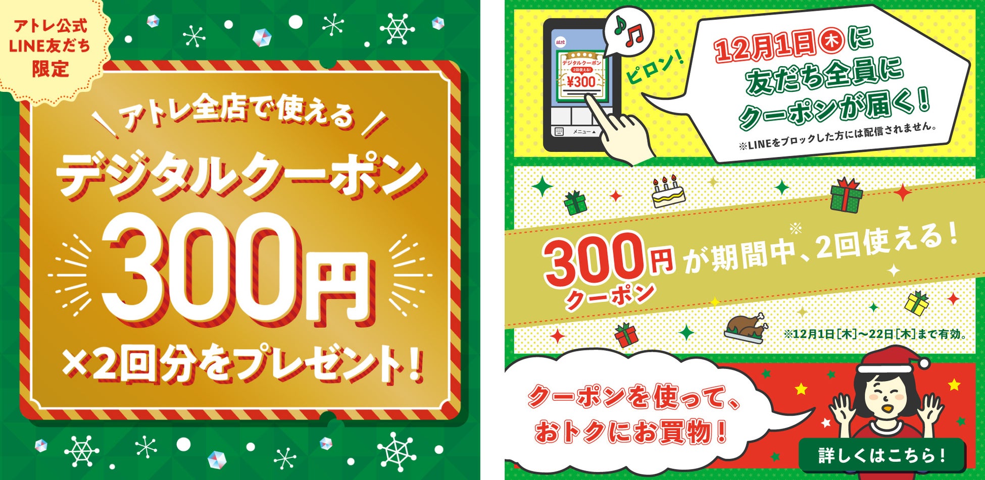 今年は6年ぶりの「休日クリスマス」であることを受け、クリスマス当日までの準備時期からアトレでのお買物を楽しんで頂きたいという思いで、通常は1回限りのクーポンを「期間中2回使えるクーポン」として実施することになりました。おトクにクリスマス期間のお買物をお楽しみ頂くとともに、アトレ各店ではクリスマスケーキ・オードブルの早期予約受付やイベントを開催します。ぜひお楽しみください。