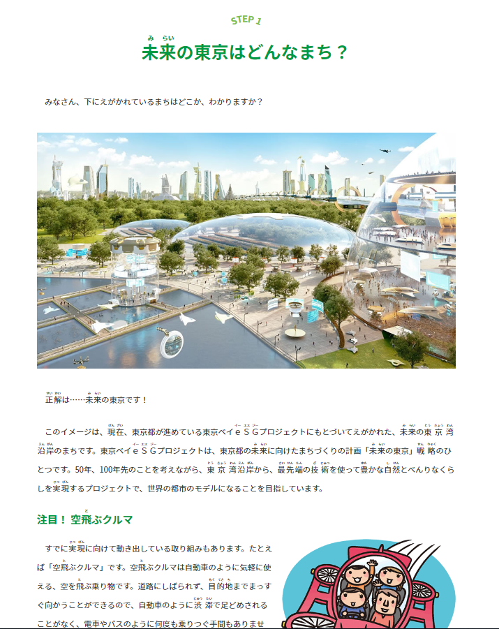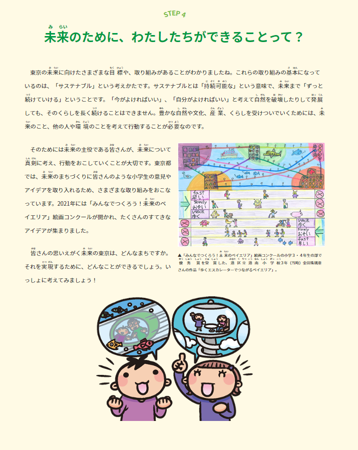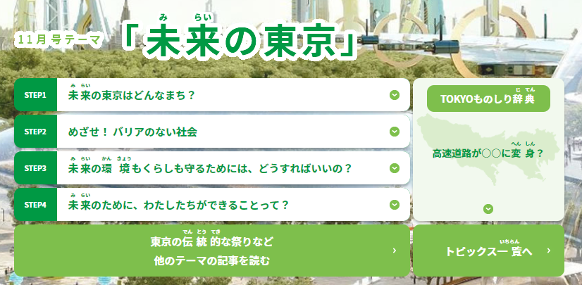 東京が目指す未来の姿を示すことで、将来を担う子供たちに希望を持ってもらい、同時に❝より良い未来に向けて今できること❞ を考えてもらおうという企画です。読めばついつい誰かに話したくなるコラム「TOKYOものしり辞典」も掲載しています。ぜひご覧ください。