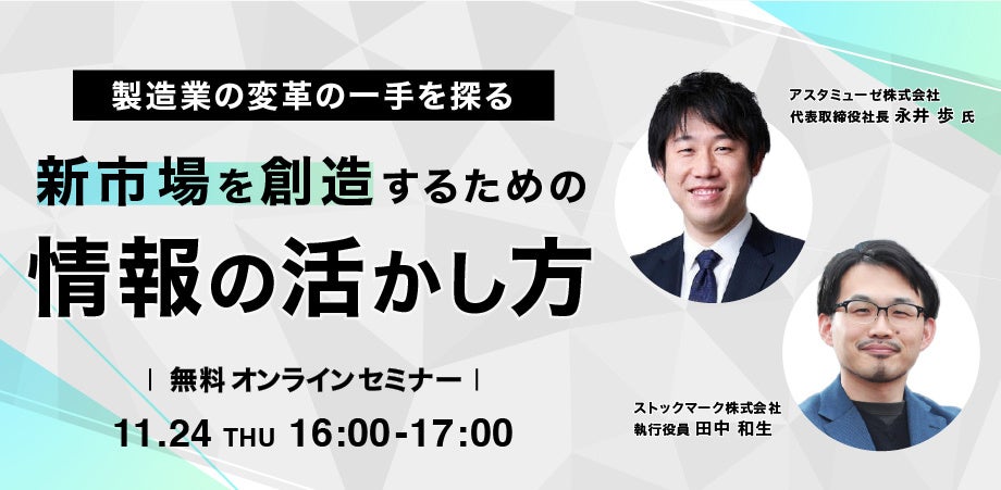 アスタミューゼ株式会社(本社:東京都千代田区、代表取締役社長 永井歩)と最先端の自然言語処理AIを活用した情報収集サービス『Anews・Astrategy』を提供するストックマーク株式会社(本社:東京都港区、代表取締役CEO 林達)は、2022年11月24日(木)16:00-17:00に、「製造業の変革の一手を探る 新市場を創造するための情報の活かし方」と題した無料ウェビナーを共同開催いたします。