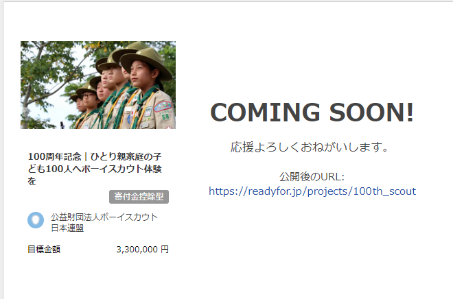 ボーイスカウト日本連盟ではこれまで、ひとり親家庭のこどもたちを対象に、ボーイスカウト運動への活動参加費用を支援する「ともにすすもう助成」を実施しています(一人3万円/年間)。この度、連盟創立100周年を迎え、この助成を支える「みらいのこどもたち基金」を創設し、この取り組みにご賛同いただく方を広く募るために、クラウドファウンディングを実施いたします。連盟創立100周年にちなみ、100人のこどもたちを仲間に迎え入れるために330万円(諸手数料含む)のお志を募るものです。