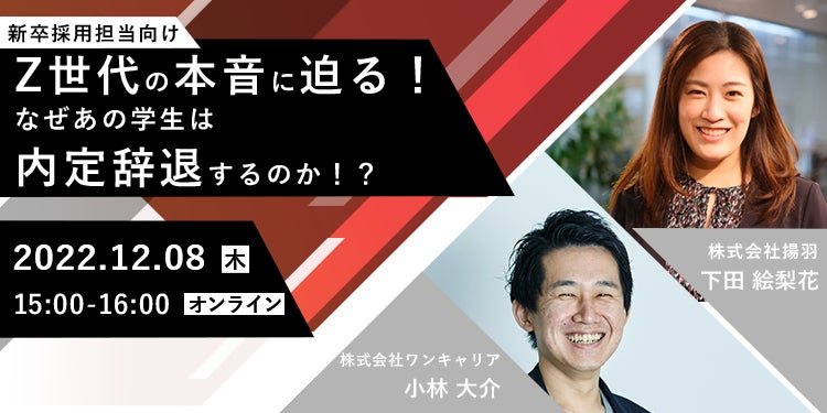 本セミナーでは、採用×インナーコミュニケーションにおいて独自の知見を有する株式会社揚羽と、新卒採用最大級のクチコミサイト「ONE CAREER」を運営する株式会社ワンキャリアの2社で、Z世代の本音に迫り、内定辞退を防ぐ方法を解説いたします。