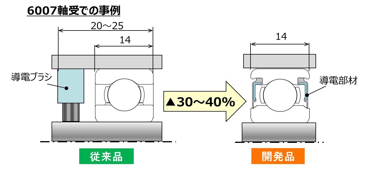 また、軸受以外での電食対策も市場では実用化されており、一例として導電ブラシやアースリングと呼ばれる導電部材がありますが、取り付けスペースや組付けの手間、さらにはコスト増の問題がありました。
