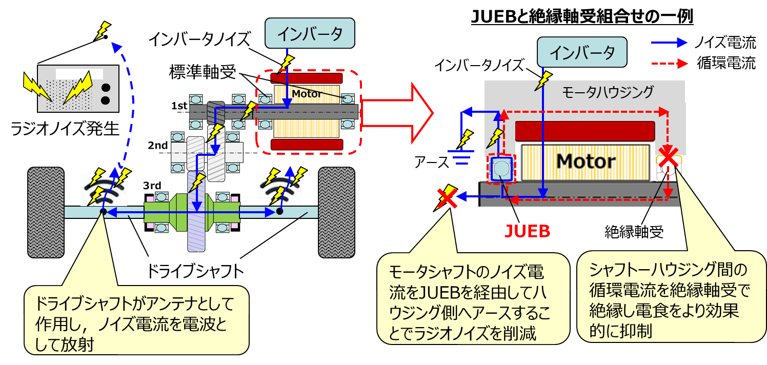 また、JUEBによりモーターの筐体とシャフトを導通させることで、インバータノイズが原因となるラジオノイズ対策等にも効果が期待できます。