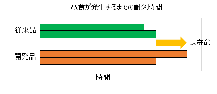 耐電食性能は、従来の市販の導電ブラシと同等以上であることを確認しました。軸受寸法はそのままで導電部材を軸受に内蔵することで、今まで軸受の横に取り付けられていた別体の導電ブラシの取り付けスペースが不要となり、その分モーター軸を短縮することが可能となります。