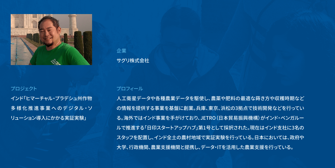 早稲田大学卒業後、大手保険会社、人材系ベンチャー、実家の介護事業とキャリアを重ね、2017年7月に、海外でのタフなキャリアパスを求めてYusen Logistics India Pvt. Ltdのベンガルール支店に着任。 現地での日系企業営業の傍ら、ベンガルールを中心としたスタートアップに魅せられ独自にネットワークを構築。2019年4月から日系アグリテックのサグリ株式会社インド法人立ち上げに参画、2度目のベンガルール赴任中。サグリのインド法人においては、マイクロファイナンスビジネス、スマート農業データ基盤事業等の立ち上げに従事中。