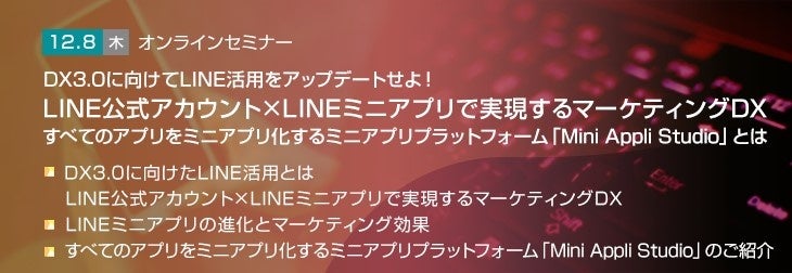 そこで本セミナーでは、LINE社が掲げるマーケティングDX、マーケティングDXを加速させるミニアプリの最新状況を説明した上で、顧客体験を進化させるミニアプリプラットフォーム「Mini Appli Studio」をご紹介します。