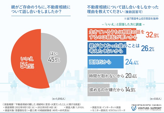 そこで、「親がご存命のうちに、不動産相続について話し合いをしましたか?」と質問したところ、5割以上が「いいえ(54.5%)」と回答した。
