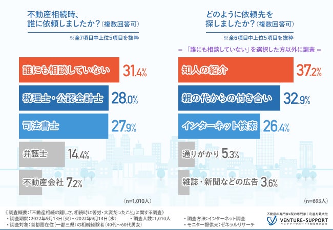 不動産相続時に、「誰にも相談していない」人は約3割に上った。専門家に相談する場合は「知人の紹介」「親の代からの付き合い」「インターネット検索」で探す人が多い。