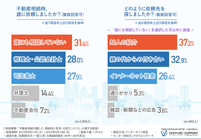 不動産相続時に、「誰にも相談していない」人は約3割に上った。専門家に相談する場合は「知人の紹介」「親の代からの付き合い」「インターネット検索」で探す人が多い。