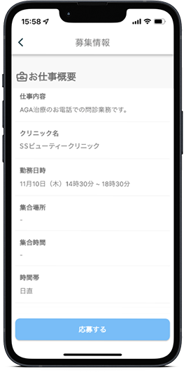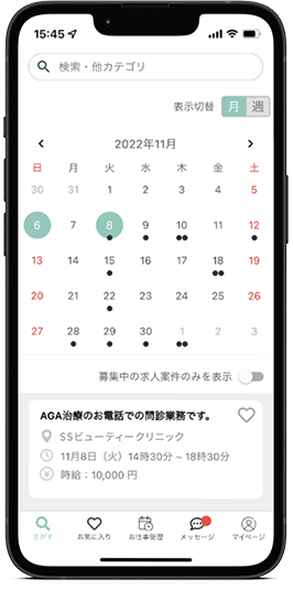求人は、全国の美容クリニックより直接アプリに配信されるので、外勤日などの働きたいタイミングに合わせてお仕事していただいたり、現在子育てなどで常勤、非常勤勤務が難しいママさんドクターの方でも手軽に応募が可能です。