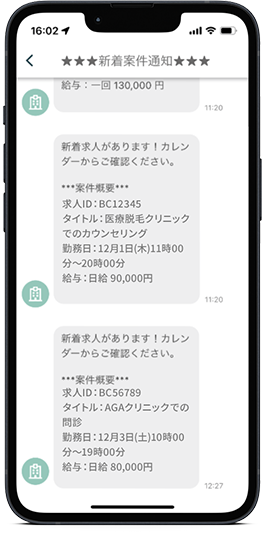 - アプリに随時新着の美容医療のスポット求人が届きます。