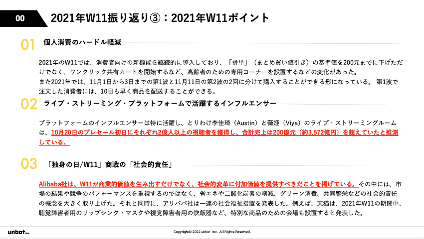 天猫、天猫国際公式TPを取得しており、EC運営代理店の中でも最高ランクの5つ星評価の獲得歴があるunbotが2021年に初回発売いたしました『中国における最新のEC&SNS市場動向(2021)』が好評でしたため、2022年更新版の販売を決定いたしました。