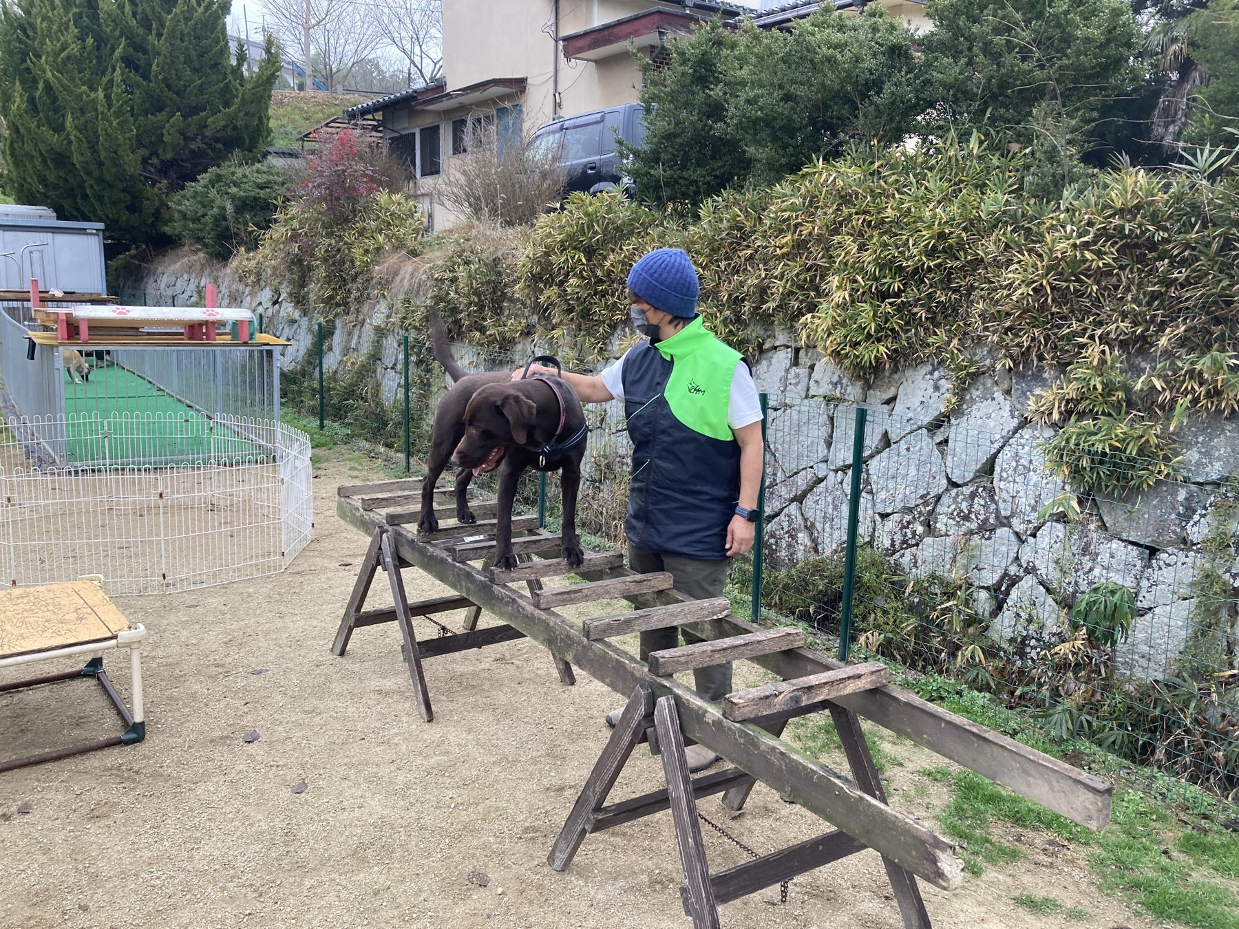 災害救助犬とパートナー訓練士(ハンドラー)が毎週訓練を行う訓練場では、国際救助犬試験の課題のうち、不安定な橋の歩行やトンネル通過などの「熟練作業」と呼ばれる科目の環境の再現が難しく、外部の訓練設備をお借りしたり、ハンドラーが道具を手作りをするなど工夫している現状があります。