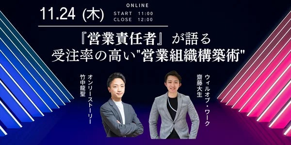 本セミナーでは、営業課題に合わせて専門チームの構築が可能なBtoB特化の営業代行サービス「セイヤク」を提供する株式会社ウィルオブ・ワークと、決裁者限定のマッチング支援プラットフォーム「ONLY STORY」「チラCEO」を通じて経営・営業支援を行う株式会社オンリーストーリーのそれぞれの営業責任者が、自社の営業組織の特徴や取り組み、支援先企業の中で特に受注率が高い営業組織の共通点などを紹介します。