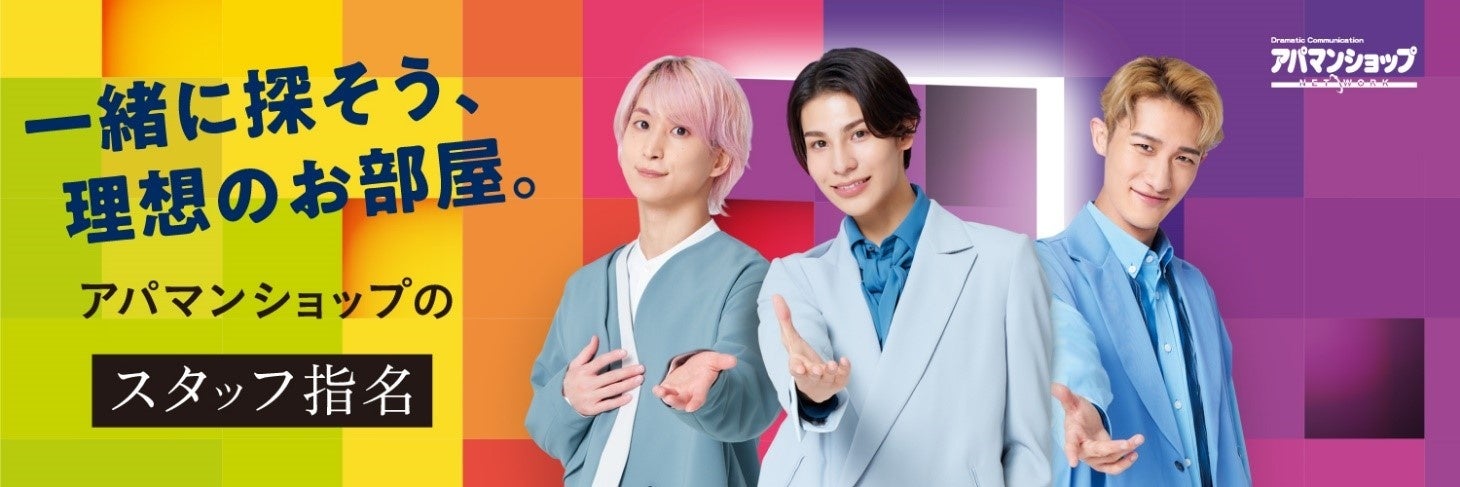 3名を起用した今回のCMでは、アパマンショップのサービスである「スタッフ指名」をご紹介。お客様にぴったりのスタッフをWEBサイトから事前にご指名いただき、一緒に理想のお部屋をさがそう、というメッセージを表現しています。
