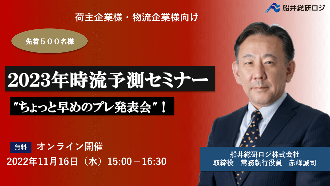 ロジスティクス・物流コンサルティングサービスを提供する船井総研ロジ株式会社(東京本社:東京都千代田区、代表:菅重宏、以下「船井総研ロジ」)は、2023年に向けて荷主企業・物流企業がやるべきことを伝える『時流予測セミナー”ちょっと早めのプレ発表会”』を2022年11月16日(水)に開催いたしました。
