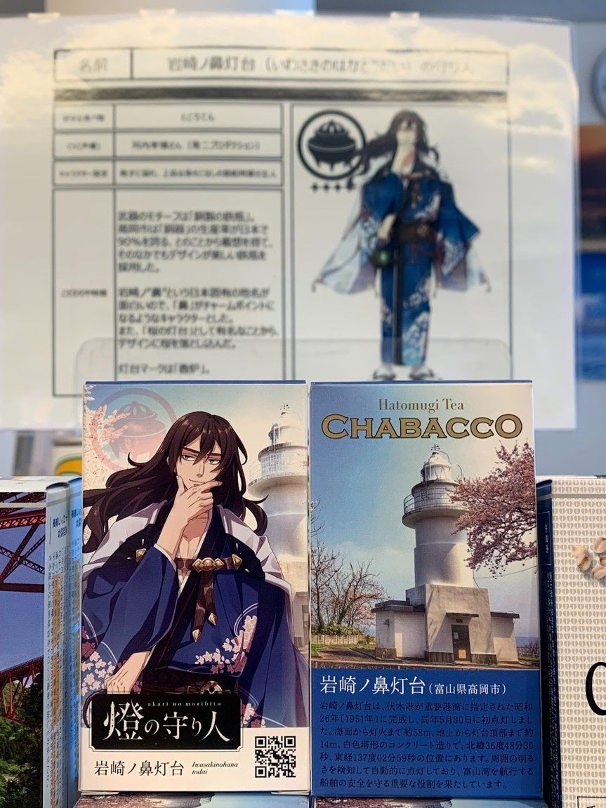 この度11月25日(金)より、富山県高岡市「道の駅雨晴(あまはらし)」は、全国灯台文化価値創造フォーラムが主催する「燈の守り人プロジェクト」で誕生した岩崎ノ鼻灯台の擬人化キャラクターを使用し、SNSでも話題のタバコのパッケージをモチーフにした箱入り粉末茶Chabacco(ちゃばこ)とのコラボ商品を発売いたします。