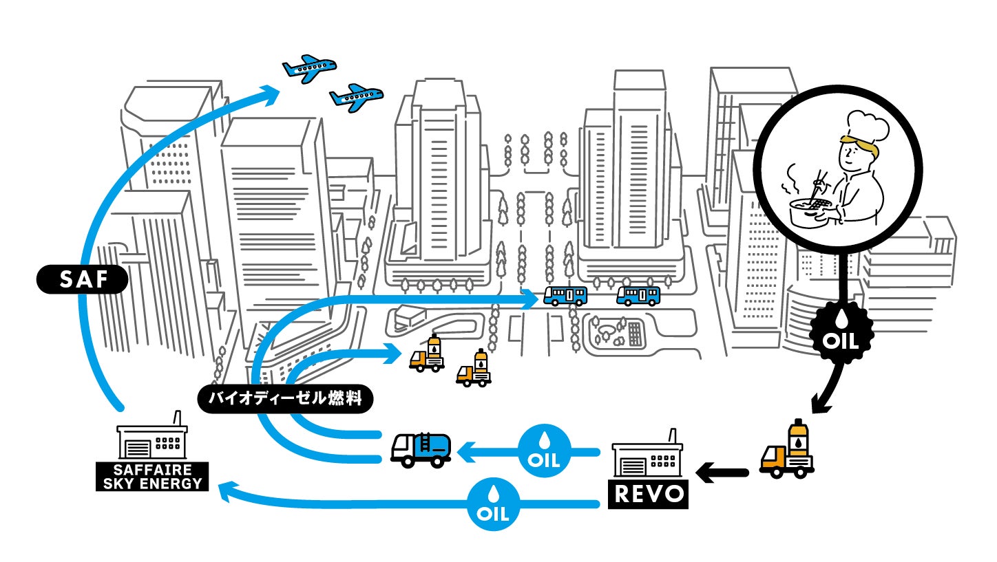 また、レボインターナショナルが収集した廃食用油は、合同会社SAFFAIRE SKY ENERGYに引き渡され、引き取った廃食用油を原料としてSAFの製造を行います。