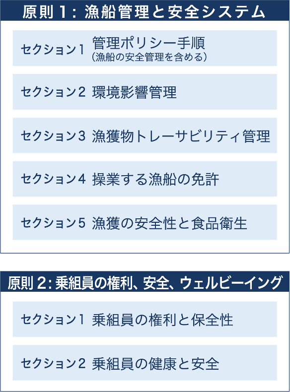責任ある漁船基準は「船舶管理と安全システム」と「船員の権利・安全・健康」の2つの基本原則のもと運用されています。特に船員の人権保護に強く焦点を当てたこの基準は、漁業労働条約やその他の国際条約に基づいたものになっています。具体的には、船員が適切な訓練を受けて安全な環境で働き、給与や食事、休憩時間が保障されていることなどが求められます。