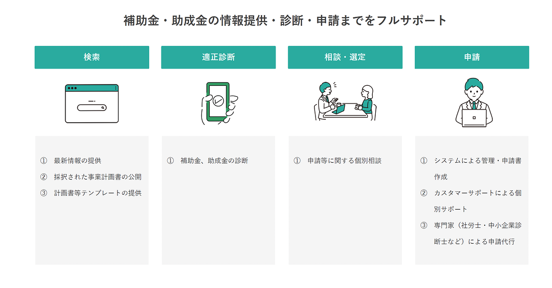 もちろん、すべての補助金・助成金の「検索・診断・選定・申請」までワンストップで対応!