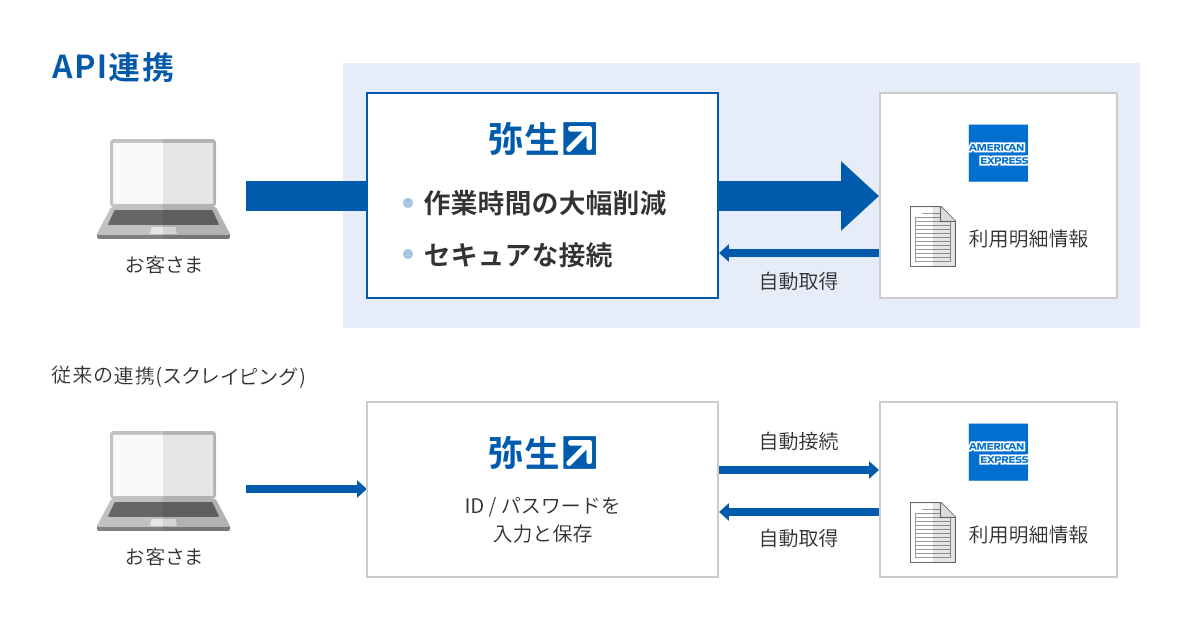 ・セキュリティの向上:これまでは、アメリカン・エキスプレスのオンライン・サービスのID/パスワードを弥生会計側に入力、保存して明細を取得することもできましたが、API連携によりアメリカン・エキスプレスのログイン情報を弥生会計に保存することなく、より安全に正確なデータを取り込むことができるようになります。