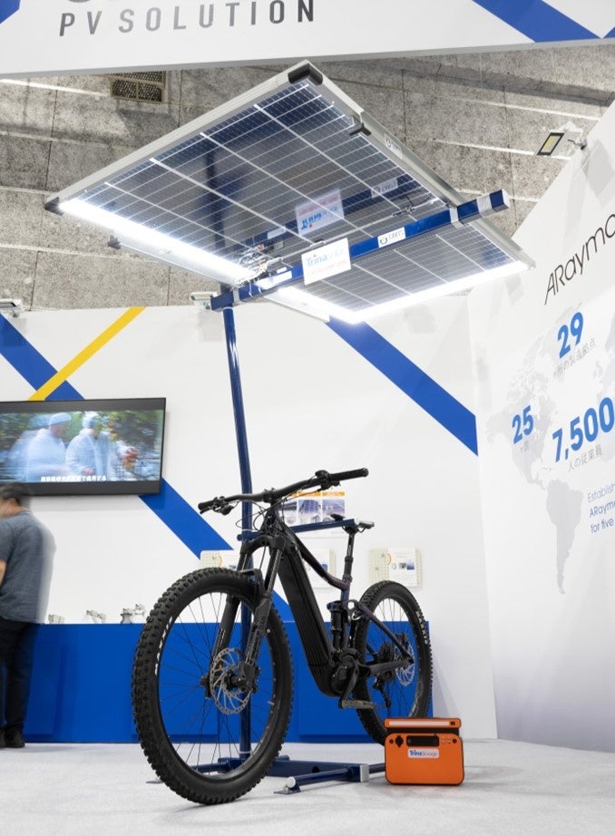 ブース内では住宅やビルなどの建物の外壁用の壁設置 ソリューションや、電気自転車用の充電型駐輪場のサイクルポート、工場や施設向けの屋根上ボルトレスソリューションの他に新製品の、小型で高出力な両面発電単結晶モジュールDEG9RC.27を展示いたしました。