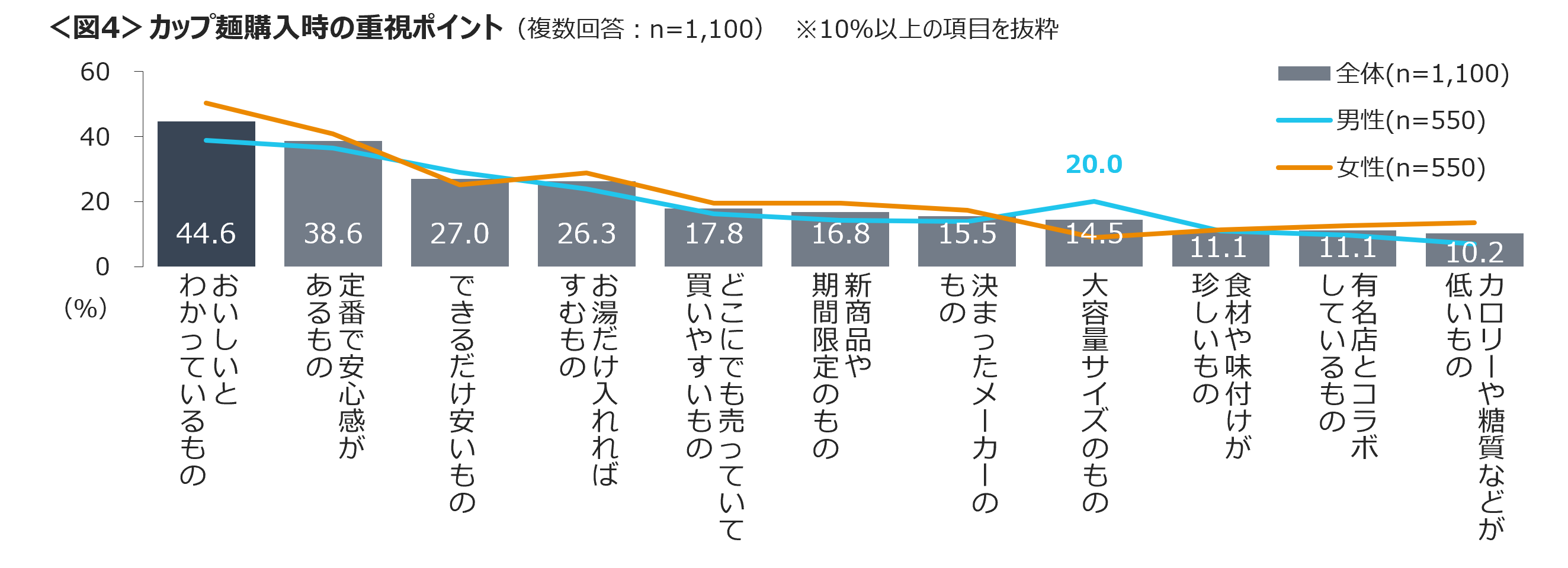 カップ麺を購入する際は、「おいしいとわかっているもの」や「定番で安心感があるもの」を選ぶ傾向。 <図4>
