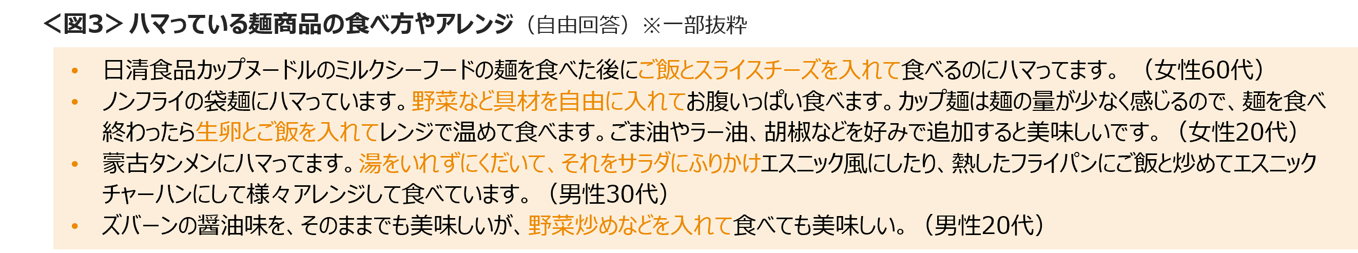 ハマっている麺商品の食べ方を聞いたところ「食べた後にご飯とチーズを入れる」「食べ終わったら生卵とご飯を入れる」など、スープを活用する食べ方や、「湯を入れずくだいてサラダにふりかける」「野菜炒めなどを入れる」など、野菜と一緒に食べるアレンジも見られた。<図3>