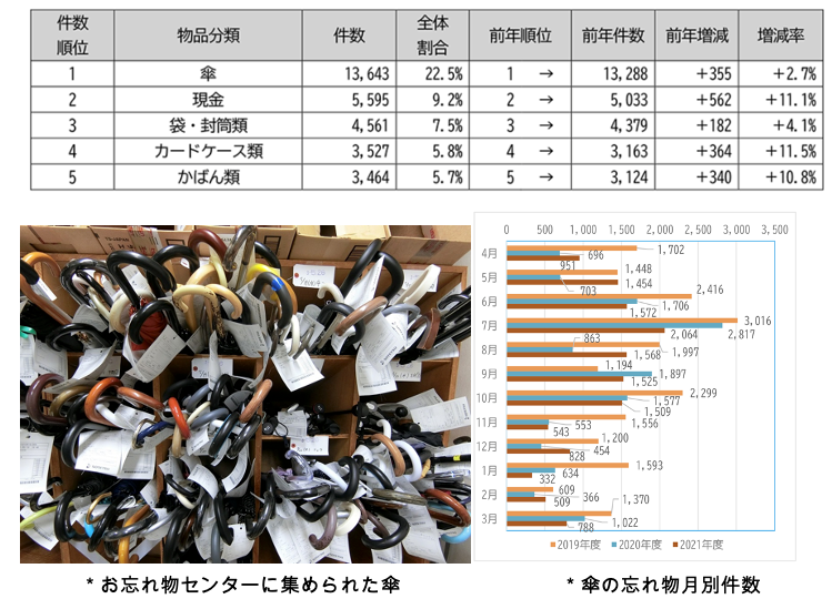 2022年6月に相鉄グループの相模鉄道㈱と相鉄バス㈱より発表された、2021年度(2021年4月1日~2022年3月31日)の駅や車内などでの忘れ物状況を取りまとめたレポート(*2の忘れ物ランキングでは、傘が最も多く13,643本(2020年度比 約2.7%増)で、忘れ物全体の約22.5%を占めました。1日あたりでは約37本となり、2位の現金5,559件(9.2%)を大きく引き離し、鉄道での業務やコスト負担として大きな問題となっております。なお、直近(2022年4・5月)と2020年の忘れ物数の同月比較では、約119.4%増となっており、今後コロナ禍から社会経済活動が回復することでその数は更に増加していくと予想されます。
