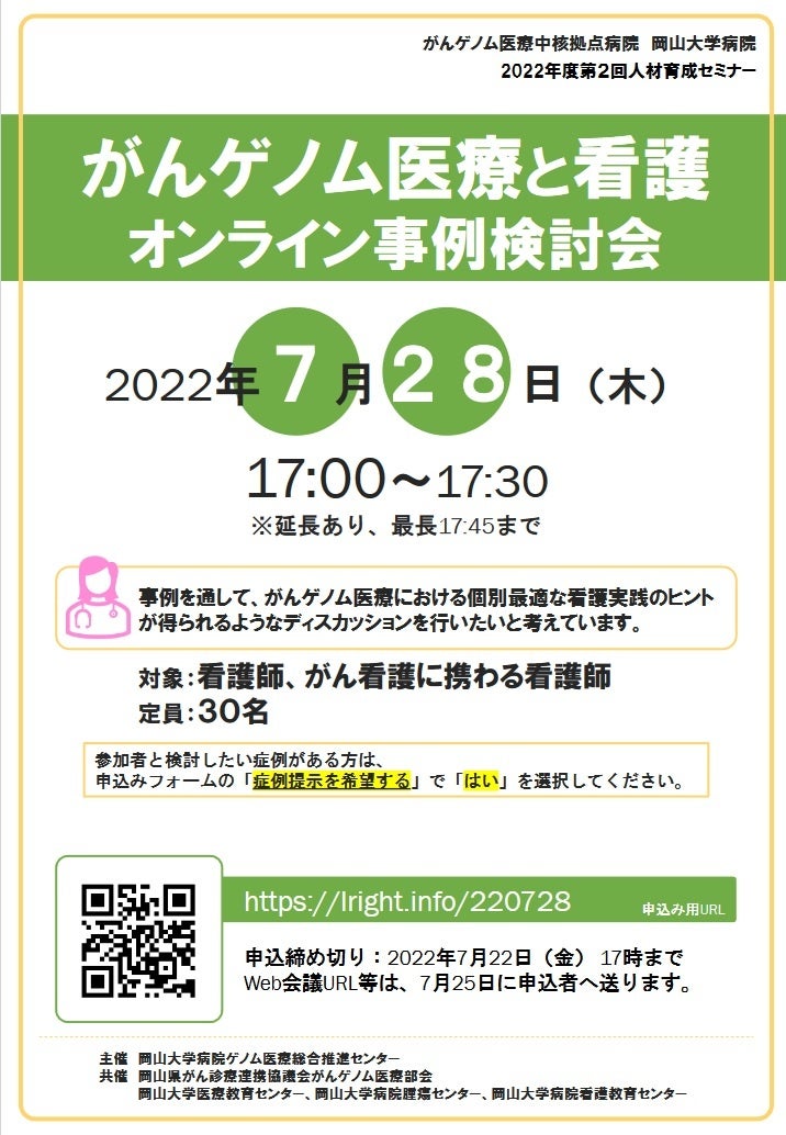 ・【岡山大学】がんゲノム医療中核拠点病院 岡山大学病院 2022年度第1回人材育成セミナー「がんゲノム医療と看護 オンライン事例検討会」〔6/2,木〕