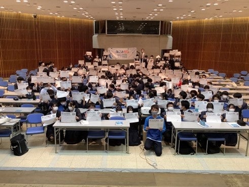 シンポジウムでは、解決策を発信するだけでなく自分たちが今後、海洋ごみ問題とどう向き合い、どう動いていくべきかも話し合われました。生徒からは「陸ごみを海に流出させないように縄を張る」や、「啓発のためにインフルエンサーを使った動画・ポスター作りを行う」など、様々なアイデアが飛び交い活発な意見交換が行われました。池田さんからは、「小さな1歩でも踏み出すことが大切!」「その輪が広がり100人が取り組めば大きなアクションになる」と人任せにしない姿勢を持って、続けることが大切と生徒らに伝えていました。生徒らは、海洋ごみをゼロにするためのこれからの行動目標を掲げ、最後は笑顔で記念撮影。地元の海を未来に残すにはどう行動すればいいのか、考えるきっかけとなったようです。