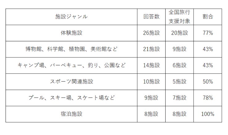 体験施設やプール、スキー場などのシーズン施設などは全国旅行支援の対象になっている割合が多く、宿泊施設も8施設すべてが「宿泊旅行施設の対象となっている」と回答しています。