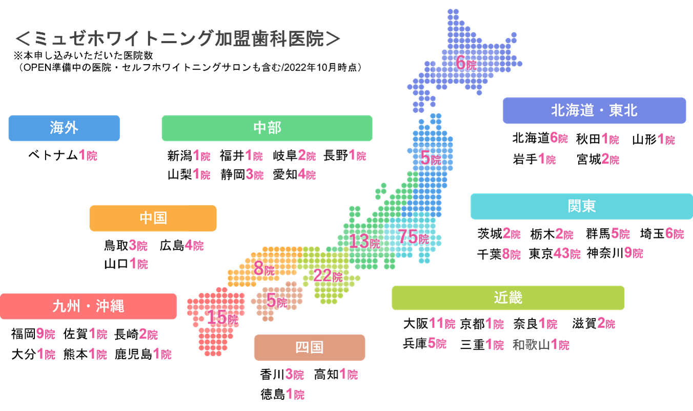 そこで、2017年10月よりホワイトニング専門医院で培ったノウハウと、ミュゼプラチナムの集患支援やブランド活用をパッケージ化した「ミュゼホワイトニングパートナープログラム」の提供を開始。この度、多くの歯科医院さまにご支持いただき、2022年10月に加盟医院数が150院(※4)に到達いたしました。