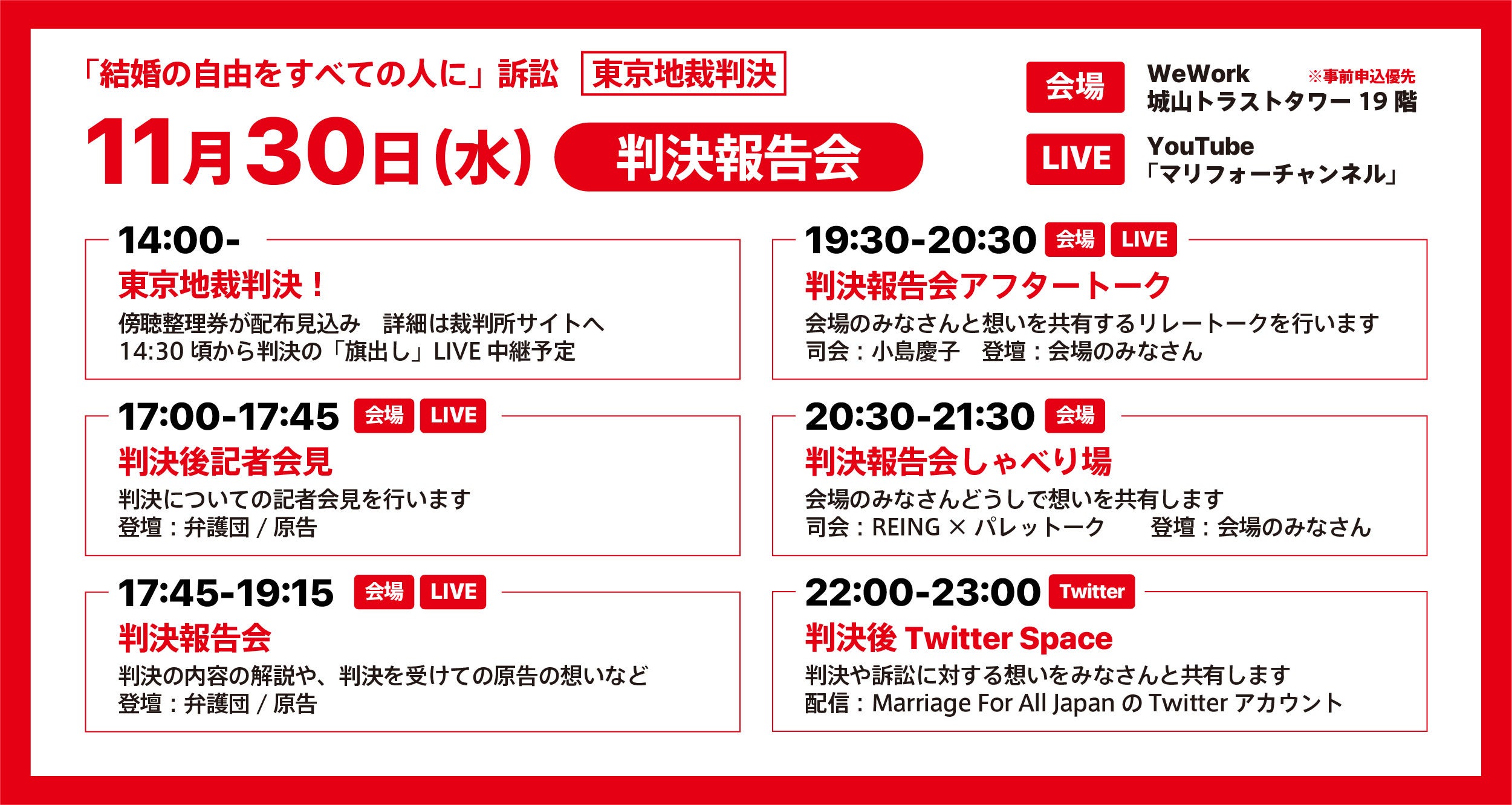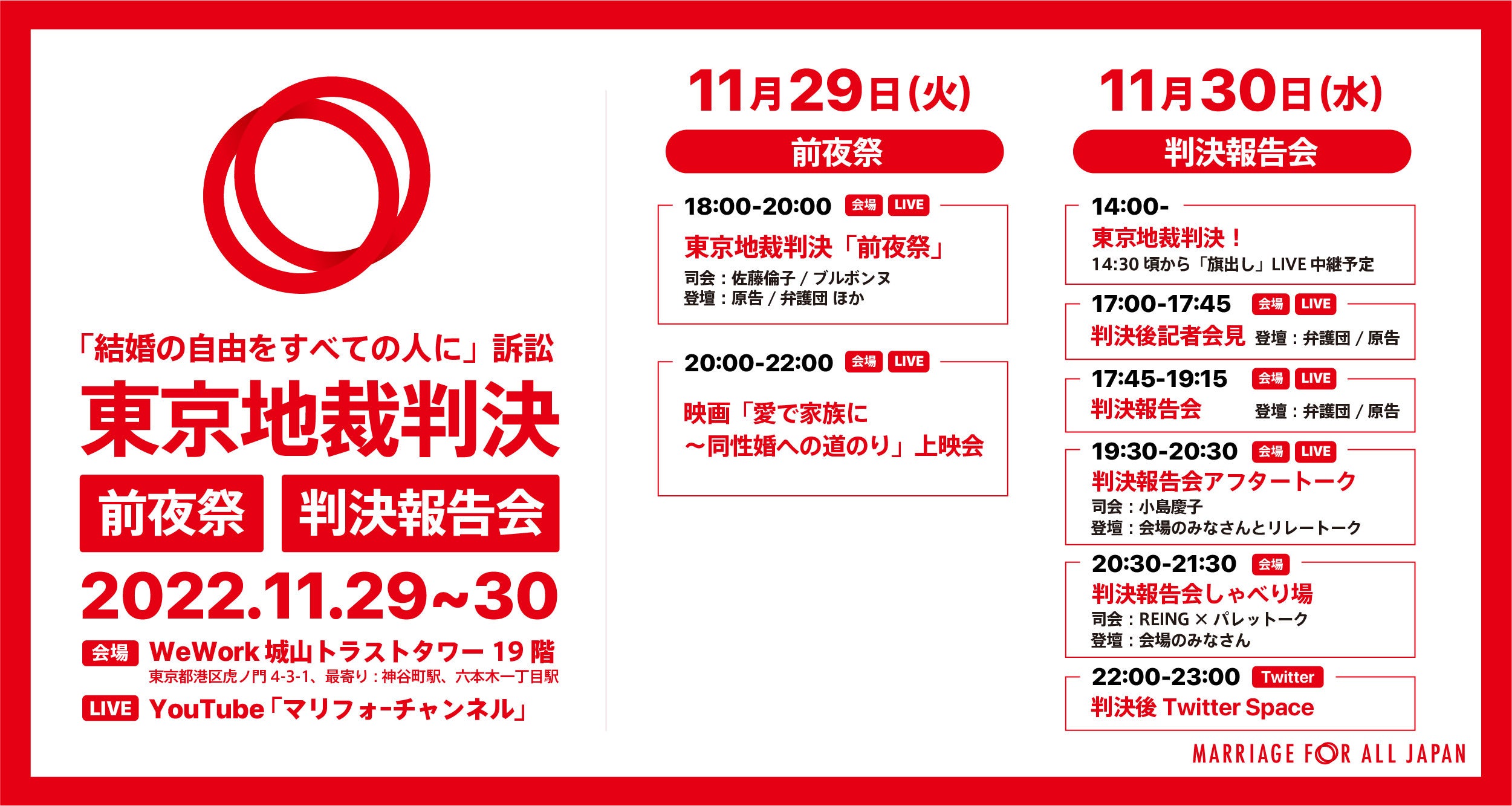 このような中、判決前日となる11月29日(火)~30日(水)当日にかけて、全国の関係者・支援者と共に判決結果を見守るイベントを開催します。訴訟経緯や判決結果の振り返りの他、原告の想いを共有するゲストとのトークイベントなどを開催します。