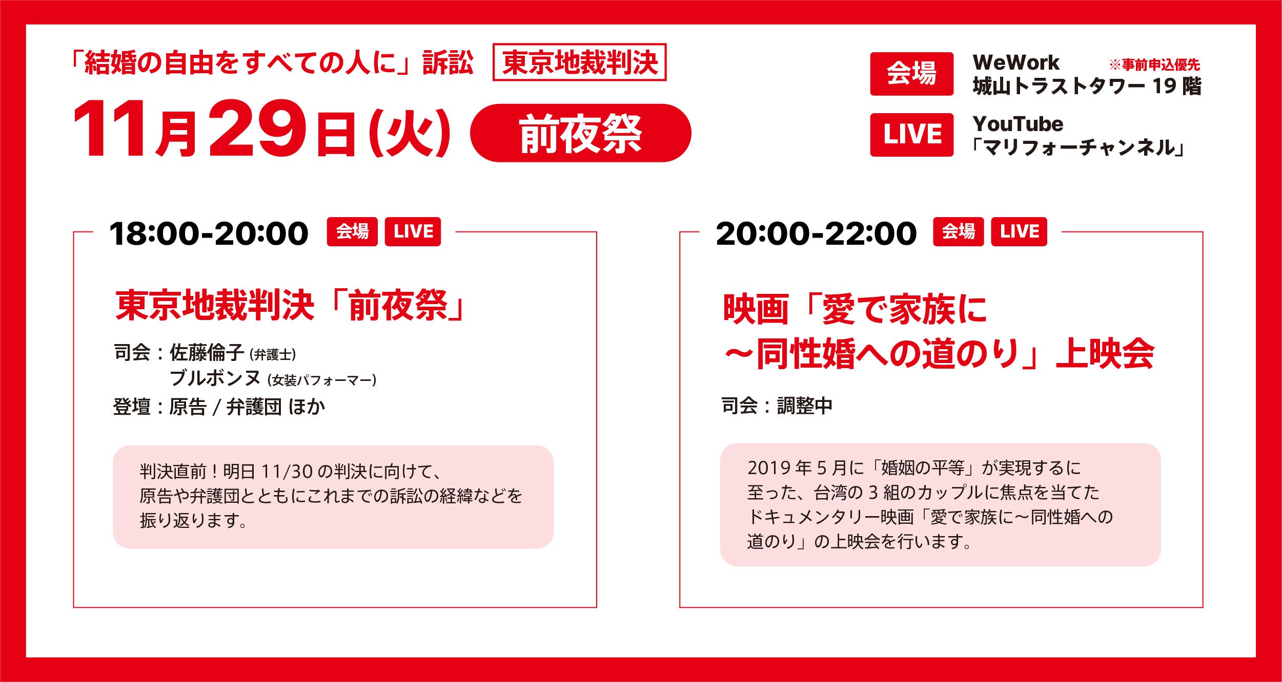 前夜祭では、これまでの訴訟経緯と判決の注目ポイントを、東京弁護団共同代表でMFAJ共同代表でもある弁護士の寺原真希子と弁護士 佐藤倫子氏と振り返ります。トークイベントでは、ゲストとして女装パフォーマーのドラァグクイーンであり、エッセイストでもあるブルボンヌさんをお呼びし、一般の方から募った質問やメッセージを紹介しながら、原告や弁護団とトークセッションを開催。また、2019年に台湾で「婚姻の平等」が実現するに至った3組のカップルに焦点を当てたドキュメンタリー映画「愛で家族に~同性婚への道のり~」の上映会を開催します。